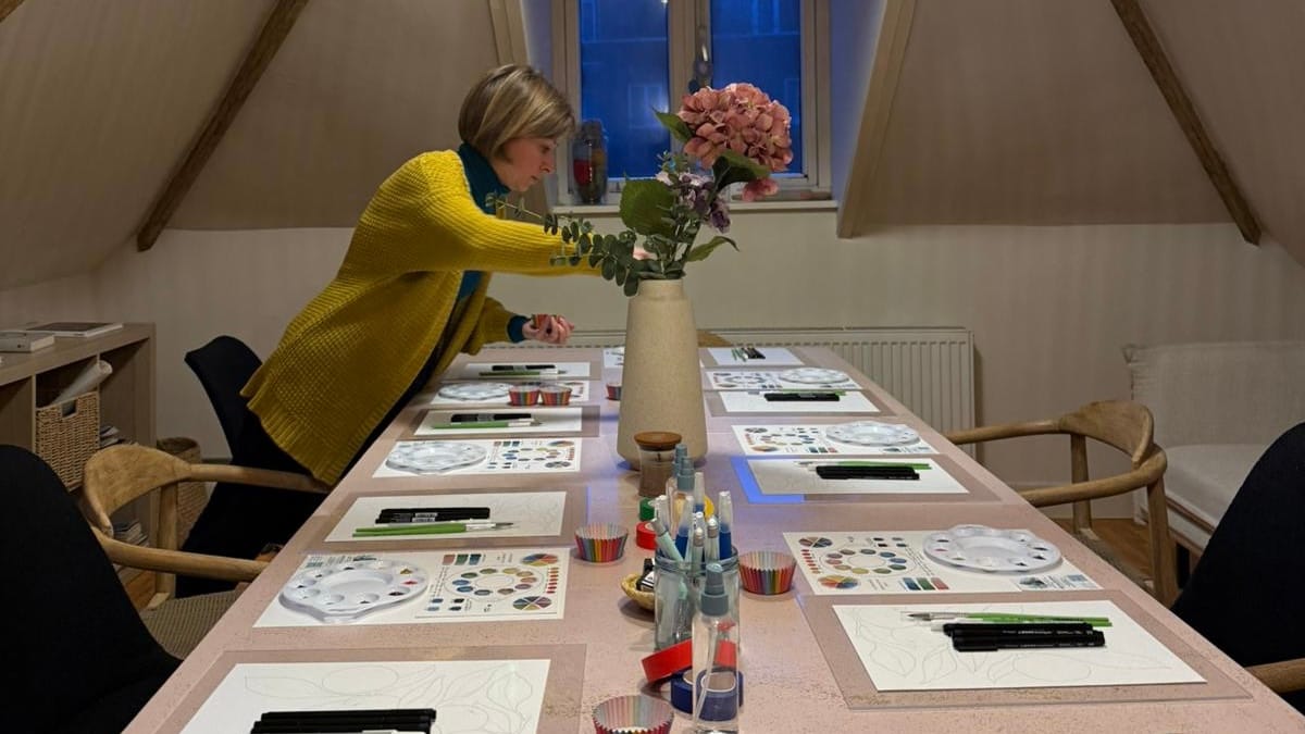There is nothing quite like creating together in person. My workshops are relaxed, hands-on sessions taught in English, designed for all levels — whether you've never held a brush before or you're simply looking for a fun, creative escape. We work on a beautiful ink and watercolor project from start to finish, in a warm and encouraging atmosphere where the only goal is to enjoy the process.